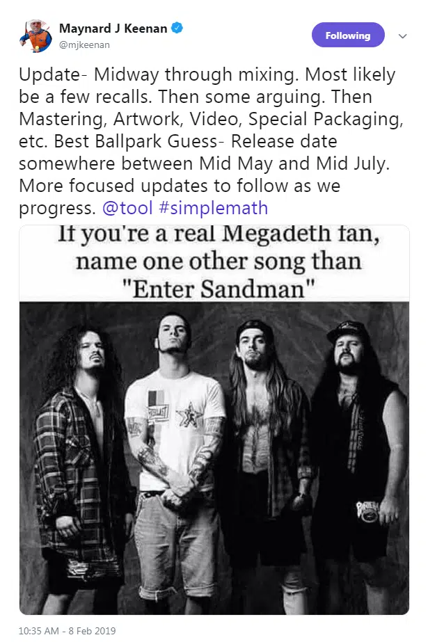 Since Twitter seems to break all news about Tool these days, we finally have an official word from Maynard James Keenan about the release of the new Tool record. Even though the update is still pretty vague, it’s better than nothing.
