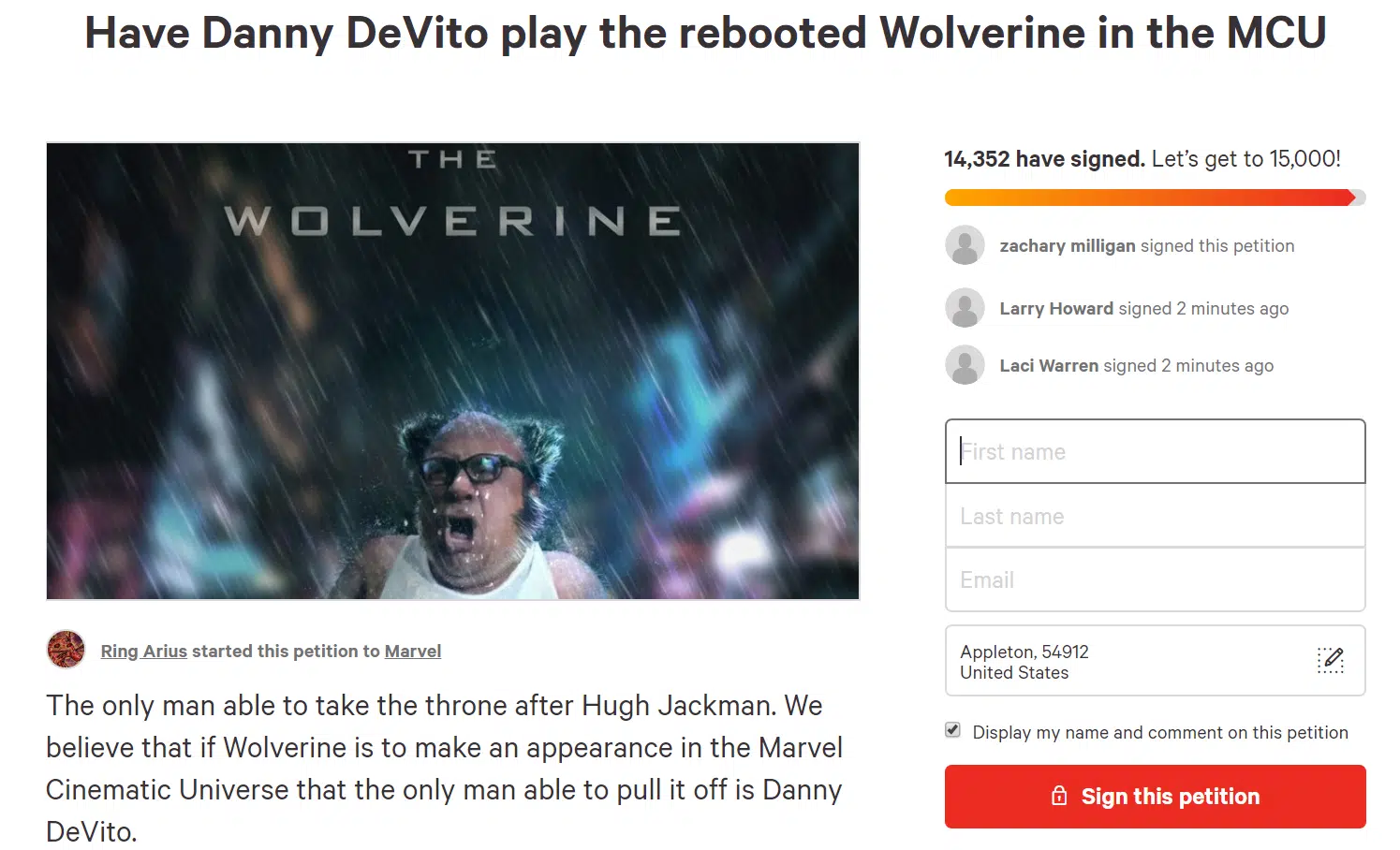 Fans apparently want none other than Danny Devito himself to portray everybody’s favorite clawed Canadian bad-ass, Wolverine. Originally brought to life on the big-screen by Aussie Hugh Jackman, thinking of Danny Devito portraying the cigar-smoking mutant is both cringe-worthy and hilarious. Take a look at the Change.org Petition Page below: