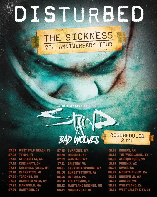 We’re pleased to announce that The Sickness 20th Anniversary tour has been rescheduled to 2021, with very special guest @Staind and @BadWolves. Tickets & VIP Experience packages are available now: https://t.co/7lz6Gj0BUS