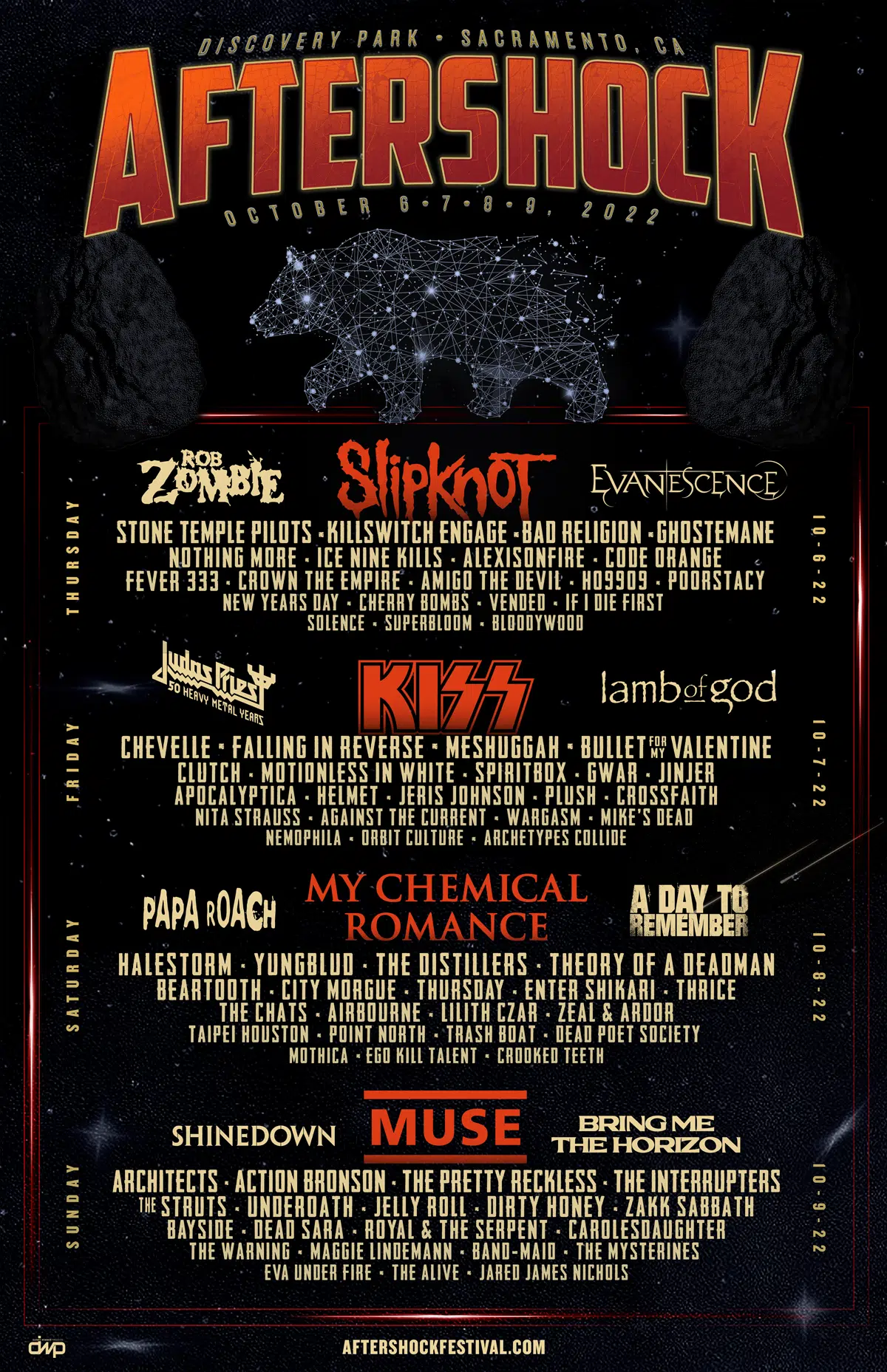Aftershock runs from October 6th through October 9th at Discovery Park in Sacramento. The festival will also feature many top-billing acts such as Slipknot, My Chemical Romance, KISS, Shinedown, Bring Me The Horizon, Rob Zombie, and so much more.