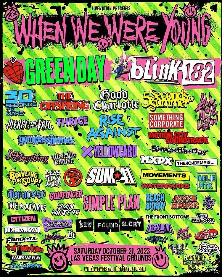 Just hours after it is announced that Tom DeLonge reunited with Blink-182, the lineup for the 2023 When We Were Young Festival in Las Vegas is announced! The festival will take place on October 21st, 2023, where the reunited Blink-182 will serve as headliners along with punk legends Green Day.