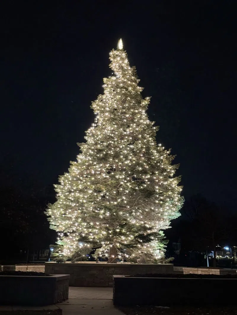 APPLETON, Wis–The large pine tree in Appleton’s City Park is finally awash in Christmas lighting. This week, crews were able to get strings of lights on the tree and get them lit at night.