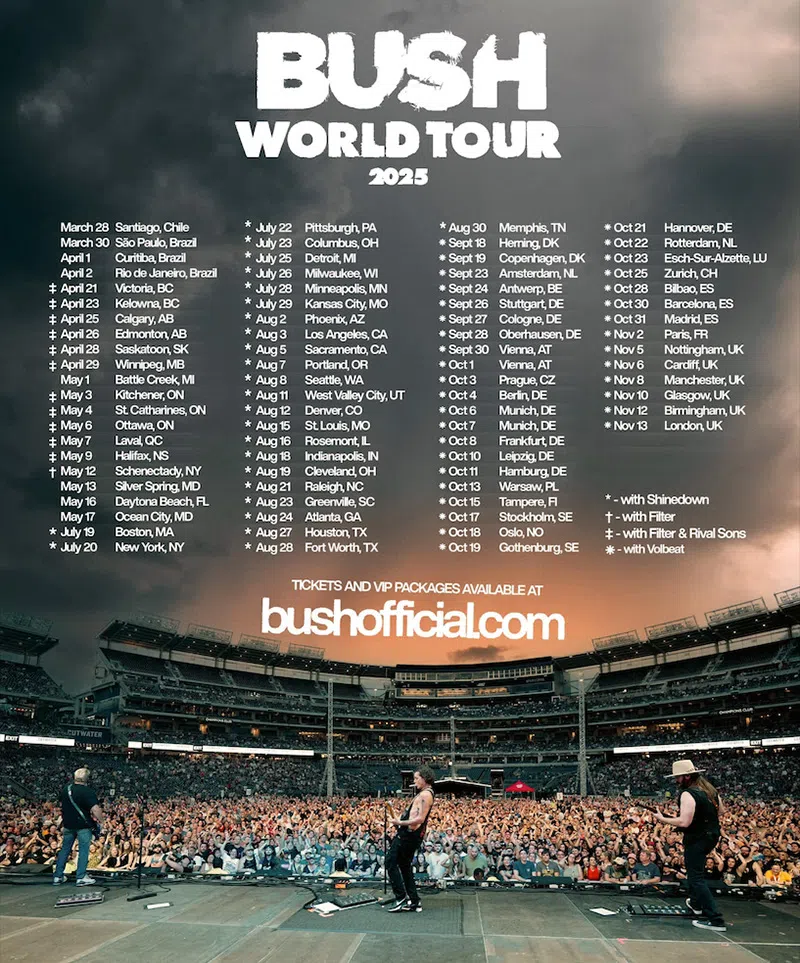 Bush are on tour the rest of this summer playing with bands like Shinedown, Filter and Volbeat. Get all tour dates, tickets, and VIP passes at Bush Official.