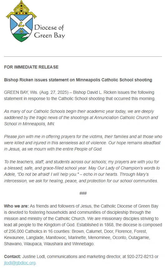 In a written statement, Green Bay Bishop David Ricken says in part: “…we are deeply saddened by the tragic news of the shootings at Annunciation Catholic Church and School in Minneapolis…Please join with me in offering prayers for the victims, their families and all those who were killed and injured in this senseless act of violence.”