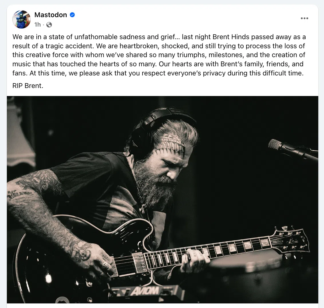 In what has been the most uprooting year for the band Mastodon one more major blow has been dealt as Brent Hinds, former guitarist, has died at the age of 51 as a result of a motorcycle accident in the Atlanta area.