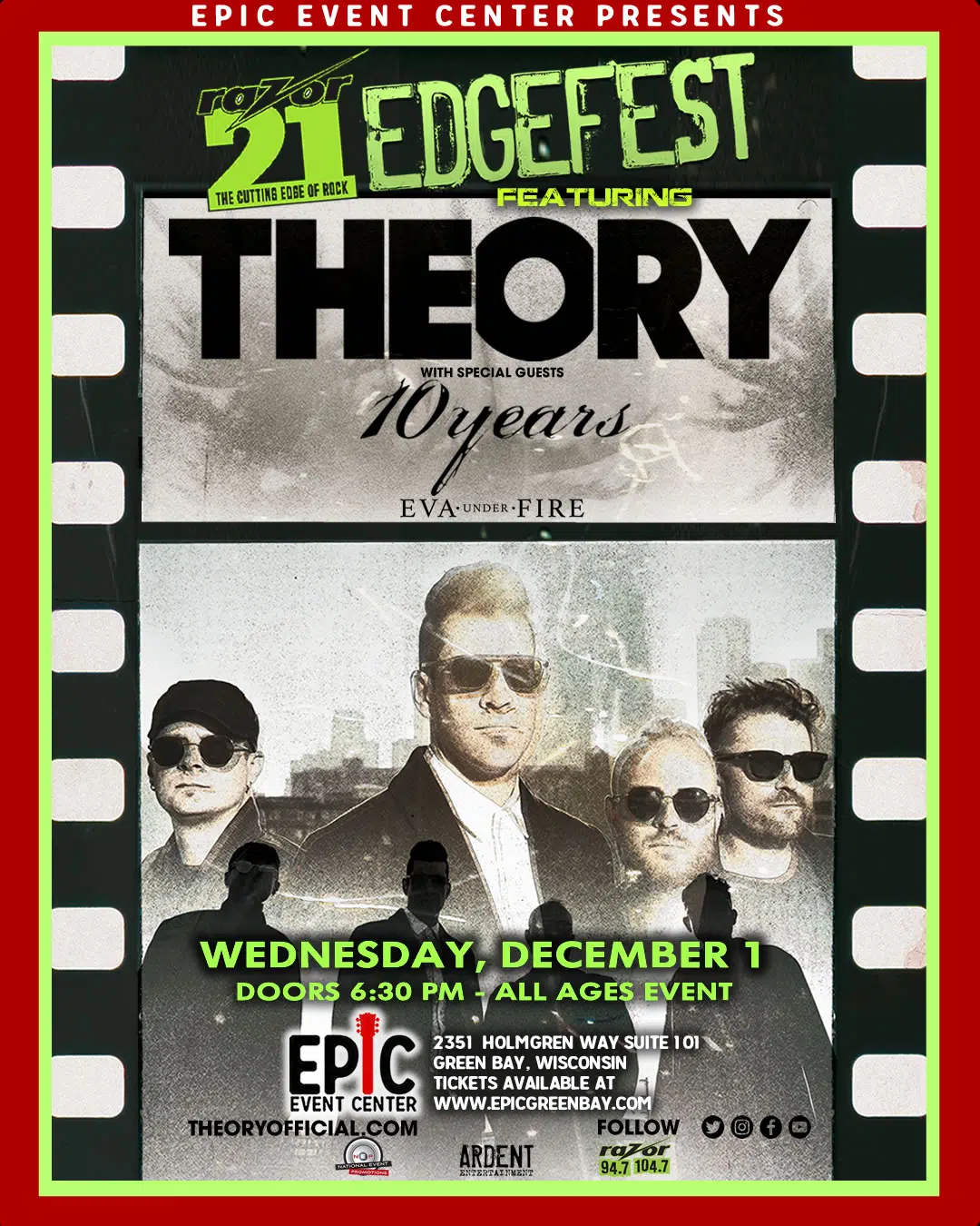 EDDGEFEST 21 RETURNS! Razor Wisconsin & EPIC Event Center welcome: Theory w/ special guests 10 Years & Eva Under Fire Wednesday, December 1st! This show is being moved from the Green Bay Distillery to EPIC Event Center. ALL previously purchased tickets will be honored for the show. Additional tickets go on sale this Wednesday at 10:00 am. This will be an all-ages, general admission show.