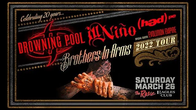 The inaugural BROTHERS IN ARMS TOUR - featuring DROWNING POOL, ILL NINO, (HED) P.E. and EVOLUTION EMPIRE - will hit The Rave in Milwaukee on March 26, 2022. As the name suggests, the package celebrates more than 20 years of friendship between DROWNING POOL, ILL NINO and (HED) P.E., all of whom rose to prominence together in 2001.
