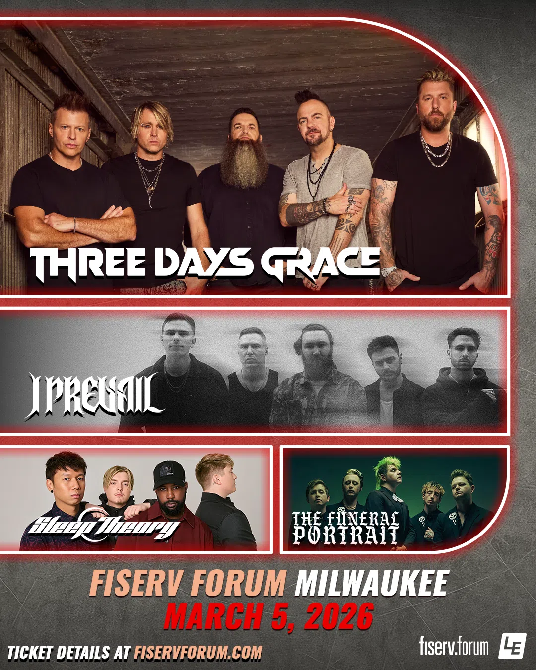 Joining Three Days Grace is a powerhouse lineup of rock’s most exciting acts. I Prevail, the Grammy-nominated band known for its dynamic blend of melody and intensity, will bring its high-energy performance to Milwaukee. Fast-rising rockers Sleep Theory continues to surge with its hard-hitting, radio-dominating sound, quickly becoming one of the most-played artists in Active Rock. Rounding out the lineup, The Funeral Portrait, coming off two No. 1 Billboard Mainstream Rock singles, brings a theatrical flair and anthemic style that fuses emotion and power into an unforgettable live experience.